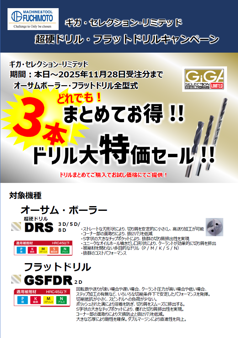 ギガセレクション 超硬ドリル&フラットドリルキャンペーン 更新日:2025.09.26 超硬ドリル&フラットドリル キャンペーン クリックで詳細がご覧いただけます→ 期間 ~11月28日まで セール内容 超硬ドリル・フラットドリルを まとめて3本以上ご購入いただくと 特別価格にてご提供 ~対象製品~ 画像クリックでカタログが閲覧できます ・超硬ドリルDRS ・フラットドリルGSFDR 一覧へ戻る
