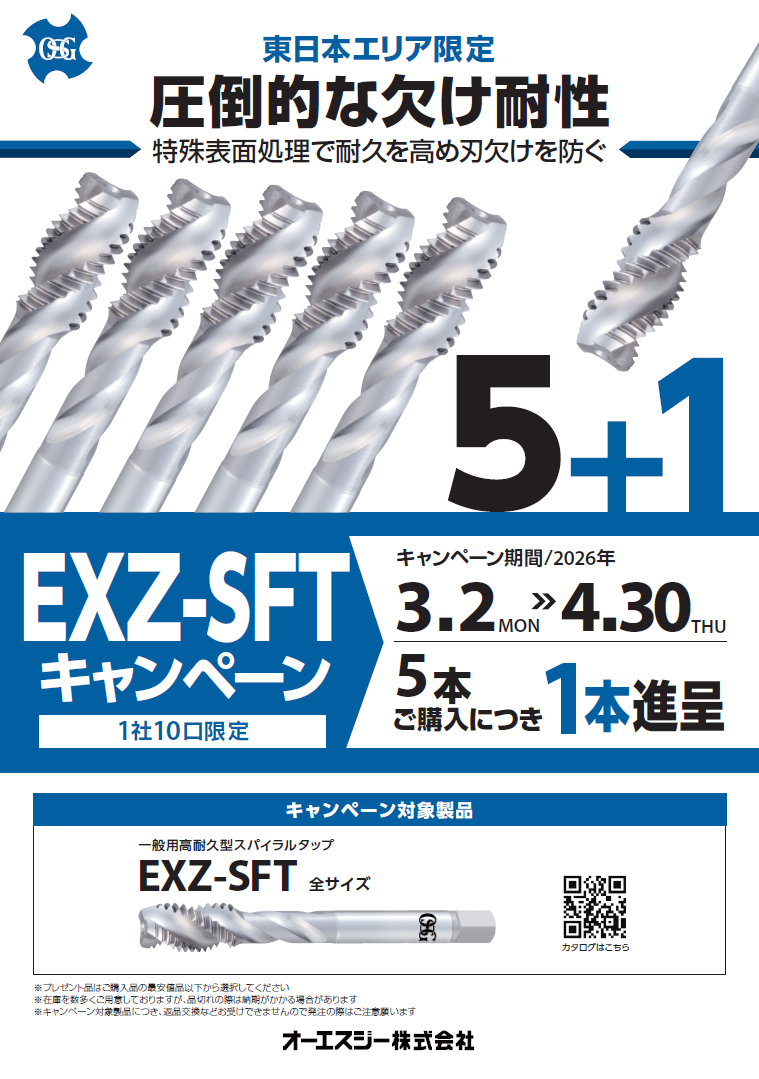 【NEW】オーエスジー EXZ-SFTキャンペーン(東日本限定) 更新日:2026.03.13 EXZ-SFTキャンペーン(東日本限定) クリックで詳細がご覧いただけます→ 期間 ~4月30日 セール内容 5本ご購入で1本サービス ~対象カタログ~ 画像クリックでカタログが閲覧できます ・高耐久スパイラルタップEXZ-SFT 一覧へ戻る