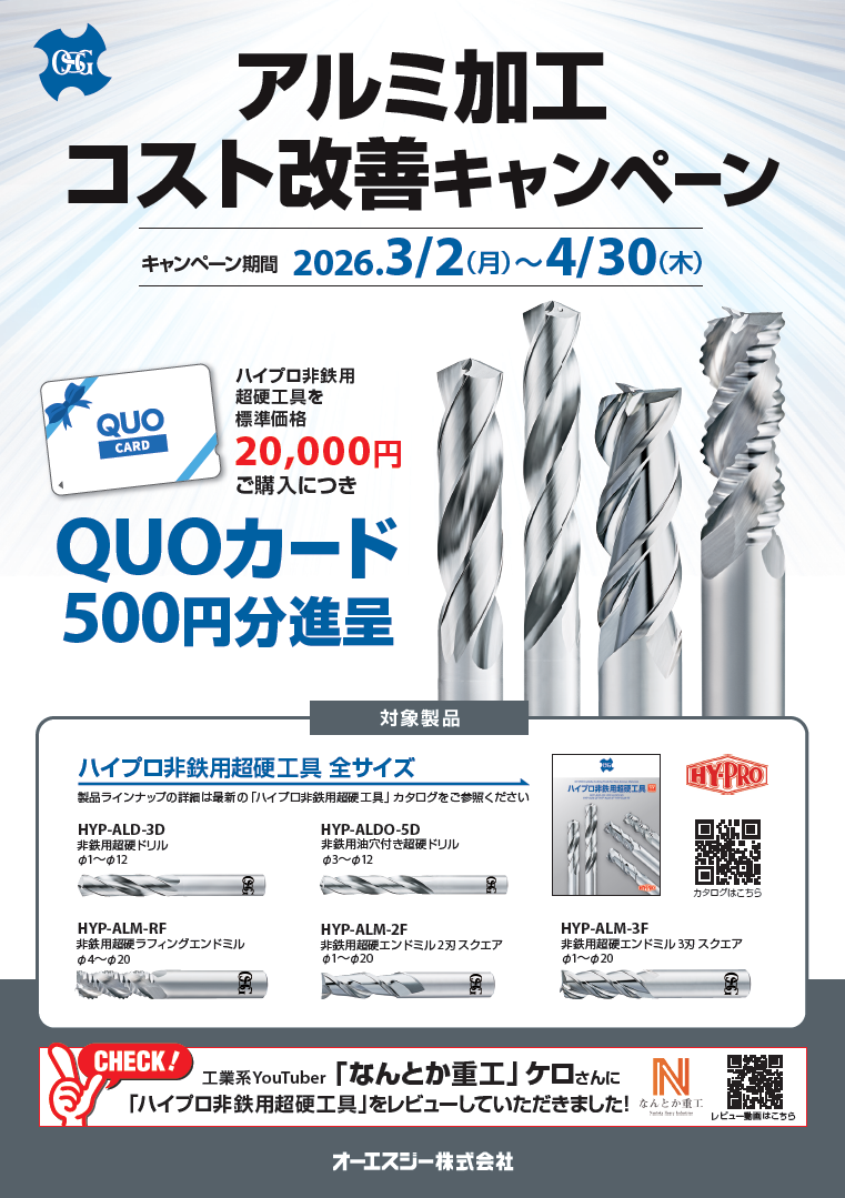 【NEW】OSG アルミ加工コスト改善キャンペーン 更新日:2026.03.17 アルミ加工コスト改善キャンペーン クリックで詳細がご覧いただけます→ 期間 ~4月30日まで セール内容 標準価格20,000円以上ご購入で Quoカードプレゼント ~対象カタログ~ 画像クリックでカタログが閲覧できます ・ハイプロ非鉄用超硬工具シリーズ 一覧へ戻る
