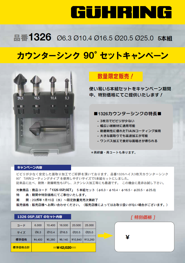グーリング カウンターシンクセットキャンペーン 更新日:2026.02.25 カウンターシンク セットキャンペーン クリックで詳細がご覧いただけます→ 期間 数量限定 セール内容 カウンターシンク90° 1326の5本セット (φ6.3,10.4,16.5,20.5,25.0) を特別価格にてご提供 一覧へ戻る