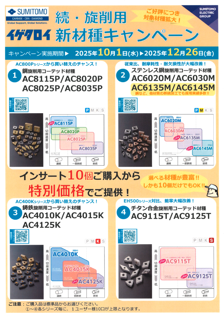 【NEW】住友 旋削用新材種キャンペーン 更新日:2025.10.01 旋削用新材種キャンペーン クリックで詳細がご覧いただけます→ 期間 ~12月26日まで セール内容 対象材種を特別価格にてご提供 ~対象カタログ~ 画像クリックでカタログが閲覧できます ・鋼旋削加工用材種AC8115/8020/8025/8035P ・ステンレス鋼旋削加工用材種AC6020/6030/6135/6145M ・鋳鉄旋削加工用材種AC4010/4015/4125K ・チタン合金旋削加工用材種AC9115/9125T 一覧へ戻る