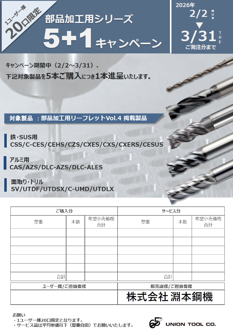 【NEW】ユニオンツール 部品加工用シリーズ5+1キャンペーン 更新日:2026.01.29 部品加工用シリーズ 5+1キャンペーン クリックで詳細がご覧いただけます→ 期間 ~3月31日まで セール内容 対象カタログ内の製品を 5本ご購入で1本サービス ~対象カタログ~ 画像クリックでカタログが閲覧できます ・部品加工用シリーズ 一覧へ戻る